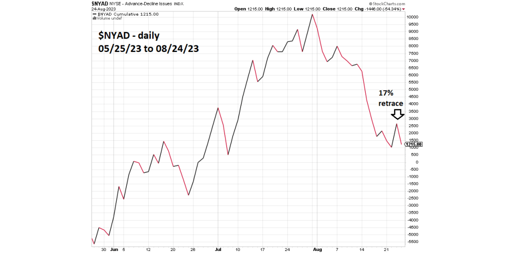 At the 8/24/23 high the SPX had retraced 45% of its downside progress since late July. As of 08/23/23 the $NYAD had retraced only 17% of its drop from late July. On 08/24/23 – 23% of NYSE stocks advanced vs. 75% declining stocks.