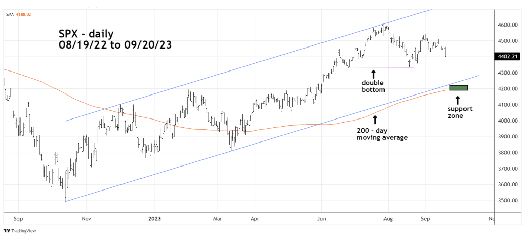 The daily S&P 500 (SPX) chart courtesy of Trading View shows two potential support zones.