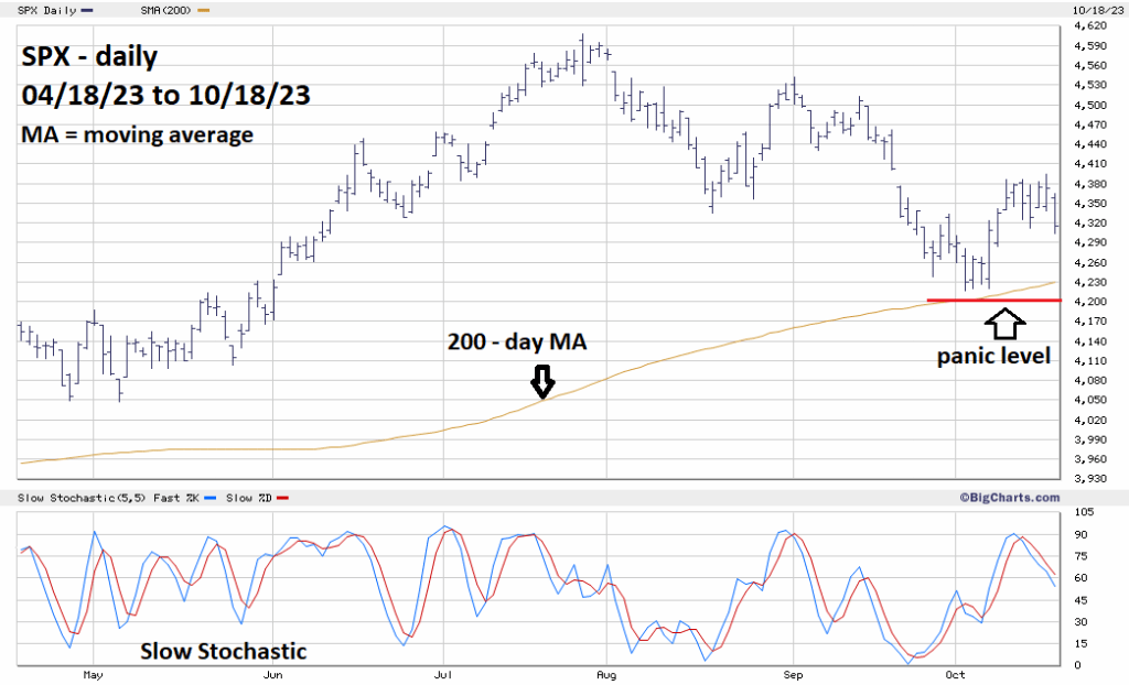 The decline on 10/18/23 reached the Fibonacci .50 retracement of the 10/03/23 to 10/17/23 rally. The much-watched SPX – 200 – day moving average (MA) has risen to 4,230. The 10/03/23 bottom is 4,216.45. A move below both these potential supports could trigger a selling panic. The potential panic level is now at about 4,200.