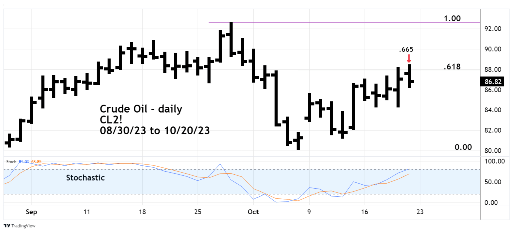 The Golden Fibonacci ratio is .618 or 34/55. Nearby is what’s referred to as an outlier Fibonacci ratio of .666 or 2/3. On 10/20/23 – CL2! – reached a .665 retracement of its 13% – 9/27/23 to 10/06/23 crash.