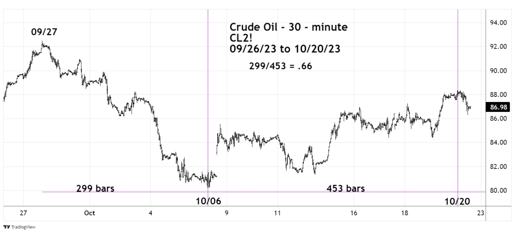 The decline from 09/27/23 to 10/06/23 was 299 – 30 – minute bars. The rally from 10/06/23 to 10/20/23 was 453 – 30 – minute bars. The outlier Fibonacci ratio of 299/453 or .66, amazing!