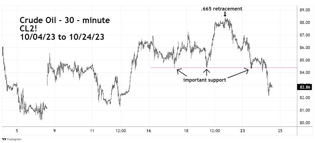The 10/21/23 blog “Crude Oil Update – 10/20/23” illustrated that Crude Oil (CL2!) had peaked at a Fibonacci .66 retracement of its prior drop. The top came at a Fibonacci .66-Fibonacci time ratio.