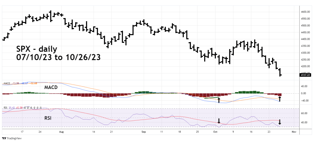 The 10/25/23 blog “Support Breaks Without a Panic” noted there was a bullish SPX – RSI divergence vs. the 10/03/23 bottom. At the close on 10/26/23 the bullish divergence was nearly eliminated. The RSI reading today was 30.42 vs. 28.66 on 10/03/23.