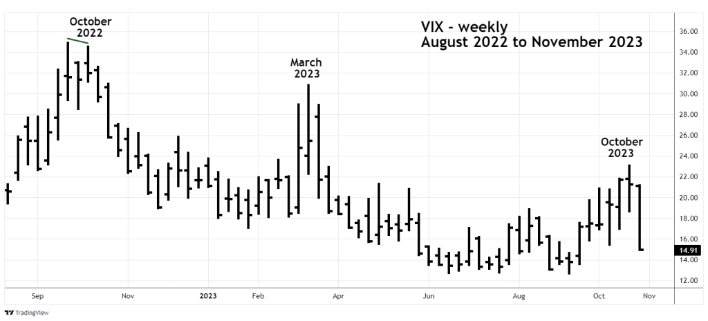 The weekly VIX in October 2023 reached a relatively low level without a divergence.