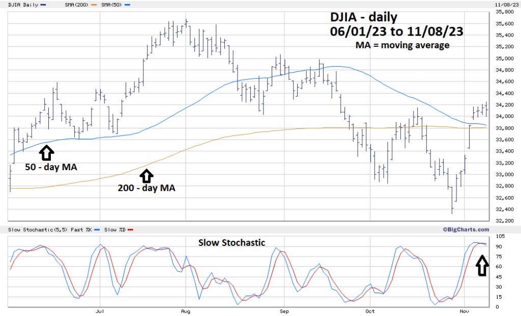 Today 11/08/23 the Dow Jones Industrial Average (DJIA) 200 – day moving average (MA) and its 50 – day MA were only 39 – points apart. On 11/07/23 the lines were 55 – points apart. A move of the 50 – day MA below the 200 – day MA – know as a “Death Cross” could happen in one or two trading days.