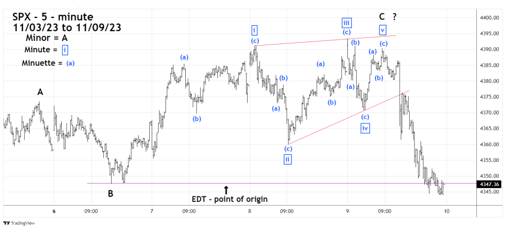 The SPX – 5 – minute chart courtesy of Trading View reveals a fascinating Elliott wave pattern.