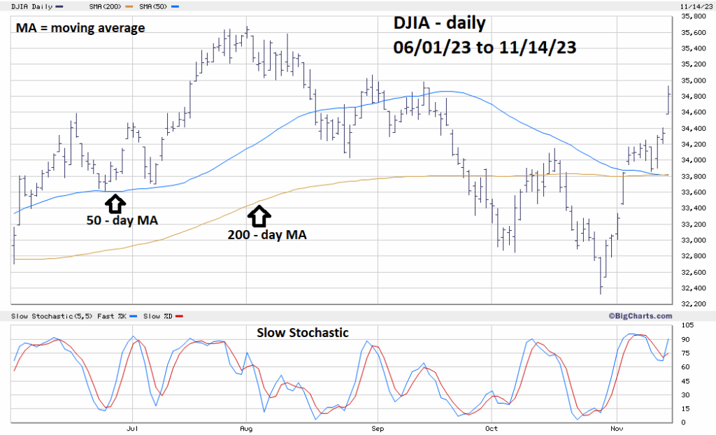 In March 2022 the Dow Jones Industrial Average (DJIA) had a “Death Cross” and in the same day made a secondary bottom. On 11/13/23 the DJIA had a marginal “Death Cross” and made a minor bottom. Today, 11/14/23 there was a massive rally.