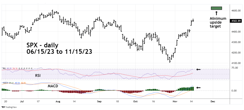 Today 11/15/23 the S&P 500 (SPX) continued its relentless rally in what appears to be a still developing Elliott wave impulse pattern.