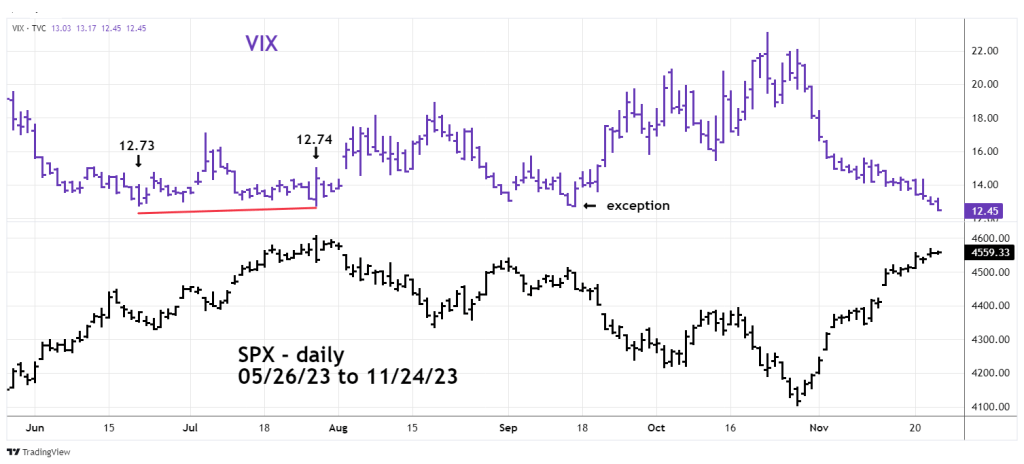 On 09/15/23 there was a rare exception. At that date the VIX went below its mid – June bottom just after the SPX made a tertiary peak. Subsequently the SPX went lower into the 10/27/23 bottom – in this case a false set up.