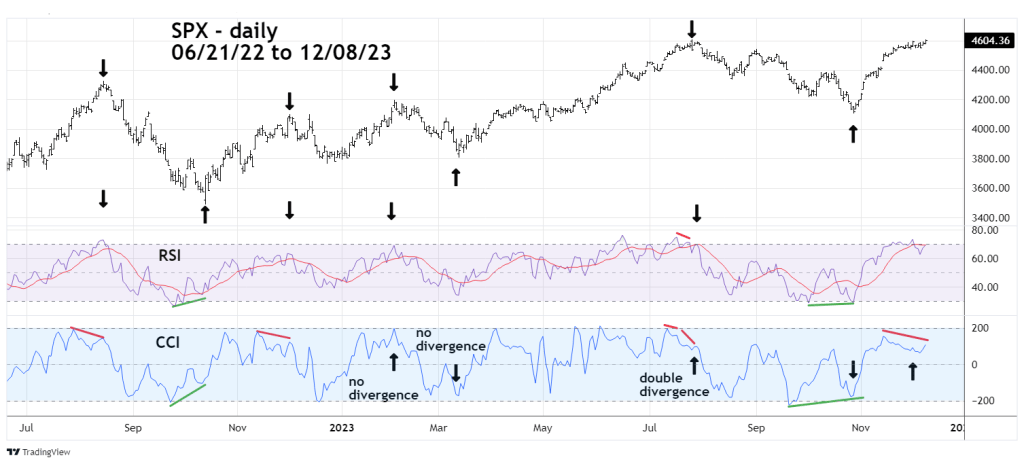 The most recent action is fascinating. Note that on 12/01/23 CCI had a bearish divergence while RSI did not. At the 12/08/23 SPX higher peak both indicators have bearish divergences implying at least a short-term decline.