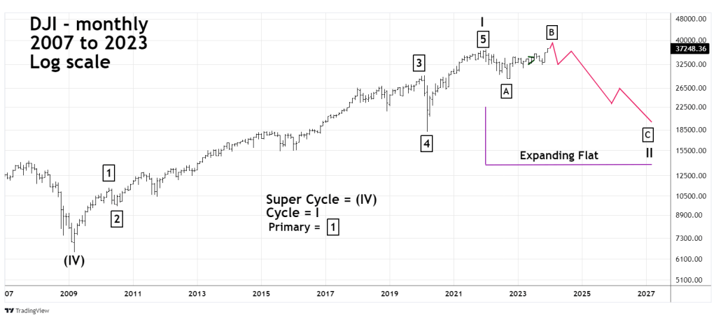 The monthly DJI chart courtesy of Trading View illustrates a possible multi-year Expanding Flat that could be forming.