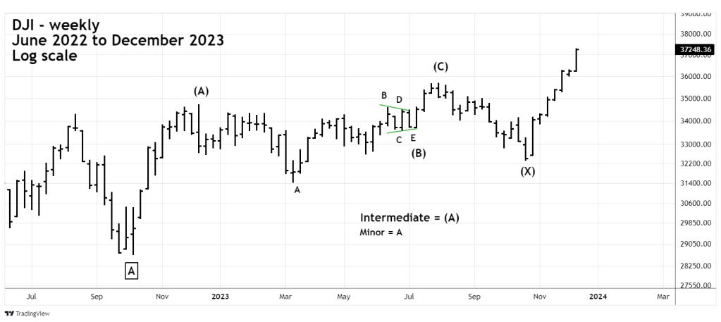 The weekly DJI chart shows a more detailed Elliott wave view of the rally since October 2022.