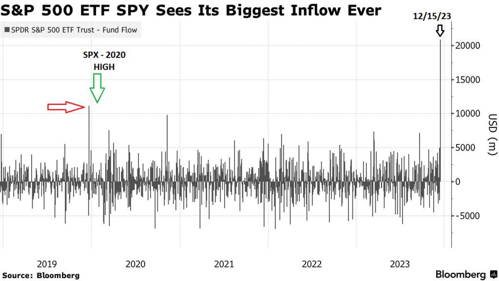 SPY is the worlds largest ETF, on 12/15/23 it recorded its largest inflow ever. Note that the next largest spike happened late in 2019 which was a little more than a month before the S&P 500 (SPX) bull market peak in February 2020. What followed was the February to March 2020 crash.