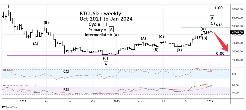 On 01/11/24 – Bitcoin in U.S. dollars (BTCUSD) reached important Fibonacci resistance and then rapidly declined. Several factors indicate this could just be the start of at least a multi-month bear phase.