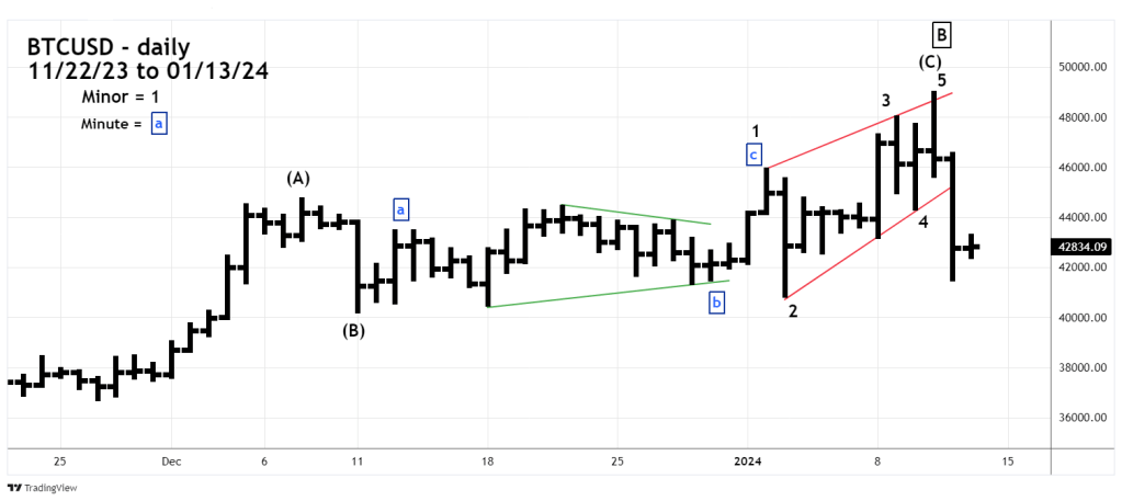 The daily BTCUSD chart zooms in on the short- term Elliott wave count.