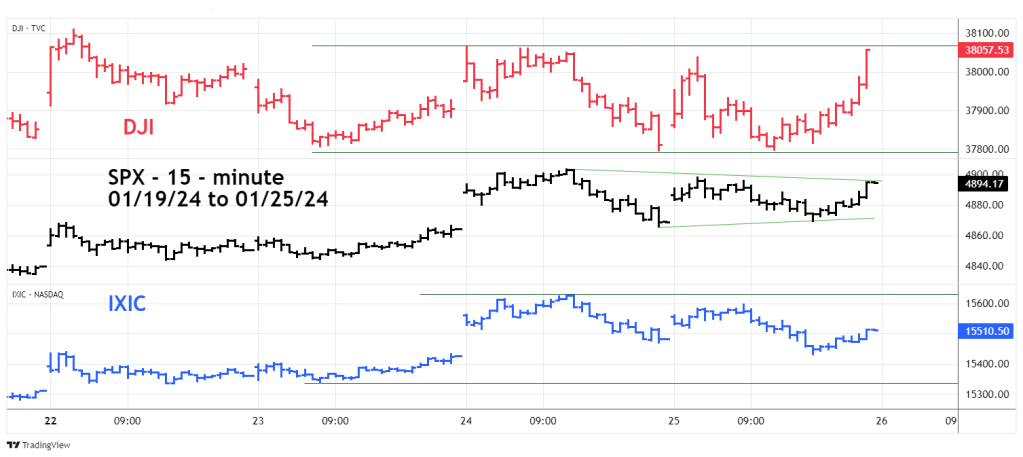 The 15 – minute chart of the Dow Jones Industrial Average (DJI), S&P 500 (SPX), and Nasdaq Composite (IXIC) courtesy of Trading View illustrates what’s been happening.