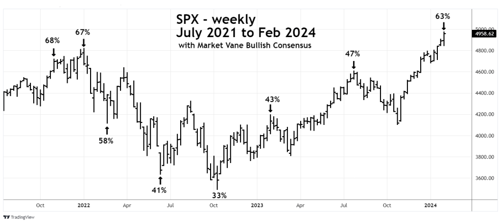 Sentiment indicators usually cannot predict the exact day of a turn. The current Bullish Consensus reading of 63% is the highest since the October 2022 SPX bottom. There could be higher readings, or the SPX could go higher with a lower bullish consensus reading.