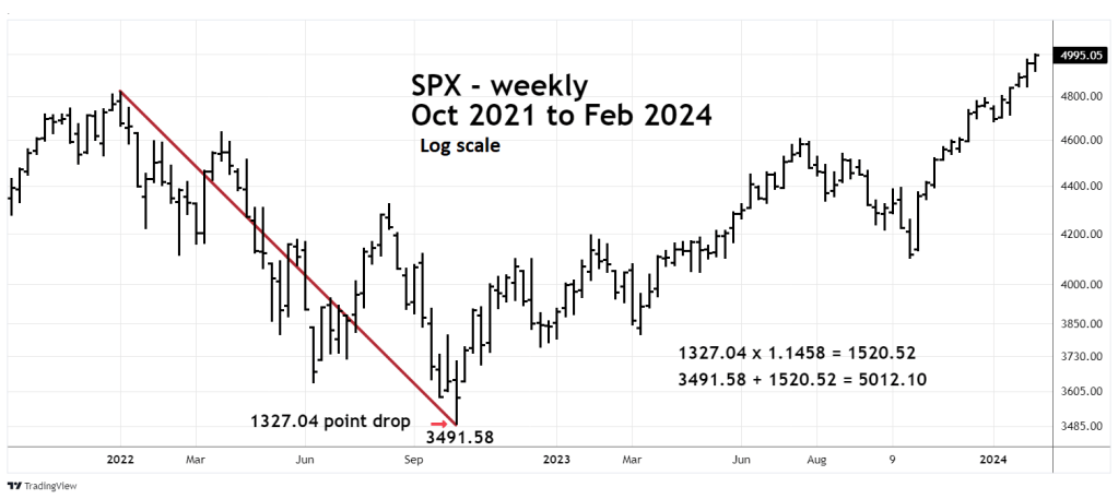 Multiplying the January to October 2022 drop of 1,327.04 points by 1.1458 equals 1,520.52 points. Adding this to the October 2022 bottom at 3,491.58 targets an SPX peak at 5012.10. This is very close to round number resistance at 5,000.00.