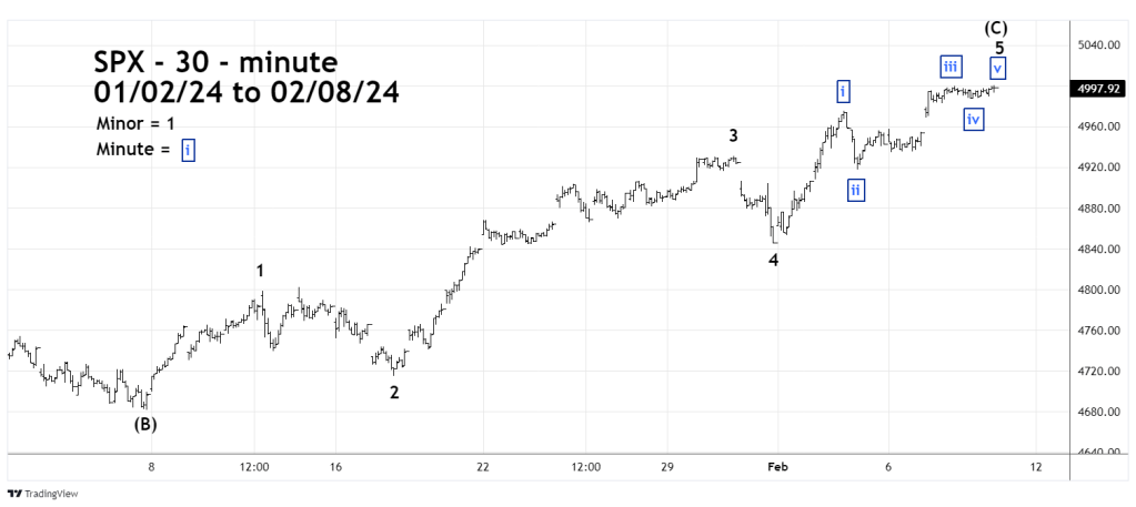 The 30- minute SPX chart zooms in on the rally from the 01/05/24 bottom.