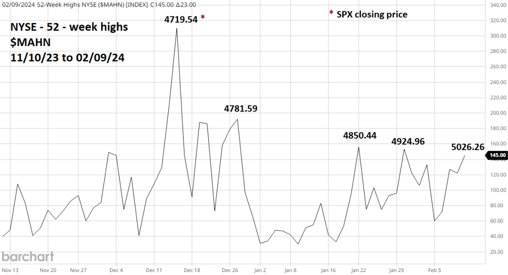 The daily NYSE – 52 – week high ($MAHN) chart courtesy of Barchart.com illustrates internal momentum for the U.S. stock market.