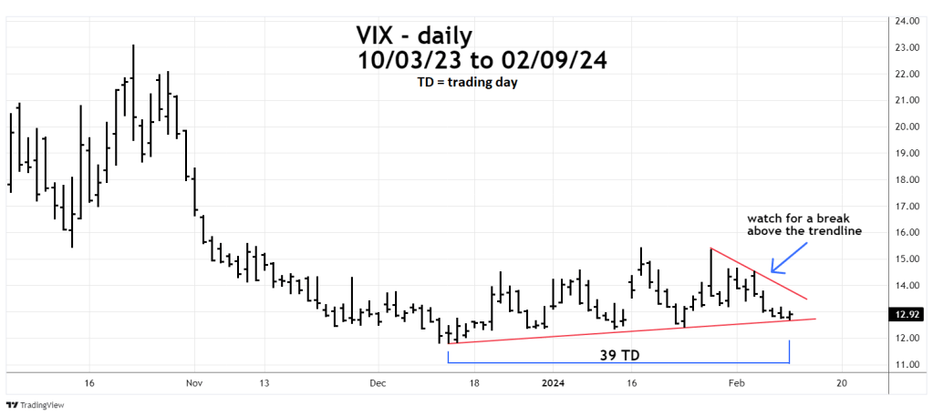 Two actions to watch for. First, a VIX movement above the declining trendline from the 01/29/24 peak. Second, VIX exceeding the high at 15.40 made on 01/17/24. If both these events occur it could be a signal for a significant SPX decline.