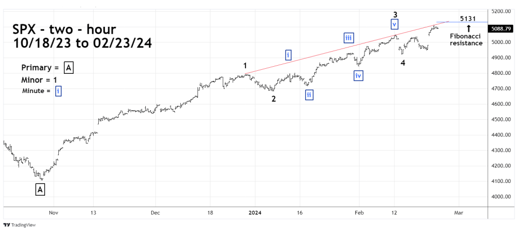 The S&P 500 (SPX) Elliott wave pattern suggests a major Fibonacci resistance point near 5,131 could be hit on 02/27/24.