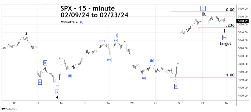 The ideal scenario is the SPX bottoming in the 5,070 area on 02/26/24. A move below SPX 5,040 opens the door to alternate counts.