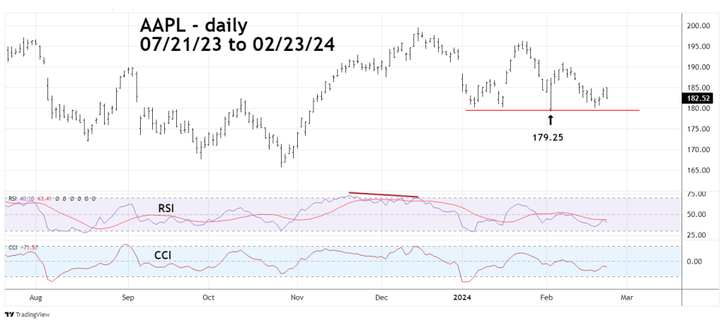 APPL was illustrated in the 02/15/24 blog “Apple Inc. Downside Rollover?” Since then, AAPL has tested support at 179.25 followed by a bounce. On 02/23/24 AAPL closed at its low of the day and could make another run at the 179.25 level. A break below this important support could open the door for a rapid drop to the 165.00 area.