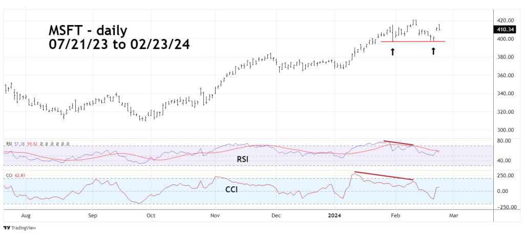 At the MSFT all-time high on 02/09/24 it had bearish RSI and CCI divergences. And as of 02/23/24 MSFT had a “Head and Sholders” pattern.