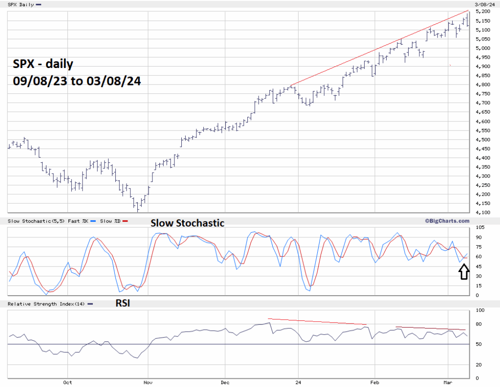 The 03/07/24 blog illustrated the Slow Stochastic lines intersecting. There’s now a bullish crossover below the overbought zone which begins at 80.00. It could be two to three trading days before both lines reach the overbought zone. The SPX has still not reached the rising trendline from late 2023. The intersection point is in the low 5,200 area and could be a zone for a potential top.