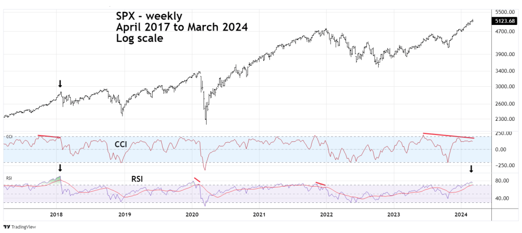 The current SPX rally since October 2023 is similar to the manic SPX rally in late 2017 to 2018. That rally was so intense the weekly RSI reached 90.5 – the highest weekly SPX – RSI reading ever! For stock indices, when RSI reaches the overbought zone there’s usually at least one bearish RSI divergence before price peaks. The SPX top in January 2018 was a rare example of price topping with RSI.