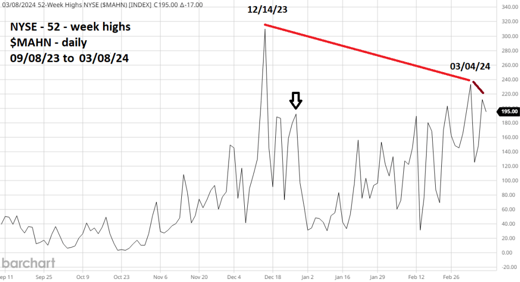 In the late stage of a stock index rally fewer and fewer stock make new rally highs. The NYSE bull move that began in October 2022 reached maximum internal strength on 12/14/23. The first bearish divergence made in late 2023 has been exceeded, yet there’s still a significant bearish divergence.