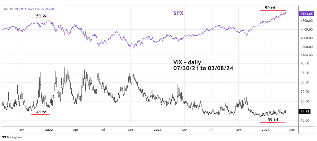 The SPX all-time high made on 03/08/24 is 59 – trading days after the VIX primary bottom. The VIX/SPX topping phenomenon is very effective, however its is not precise.