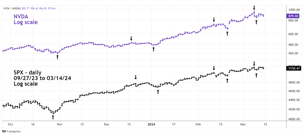 Since late October 2023 NVDA and SPX have made turns within about trading days of each other. Sometimes they’ve turned on the same day. Please note the tops on 03/08/24 and the bottoms on 03/11/24.