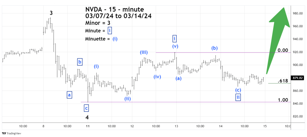 The 15 – minute NVDA chart shows its recent Elliott wave pattern.