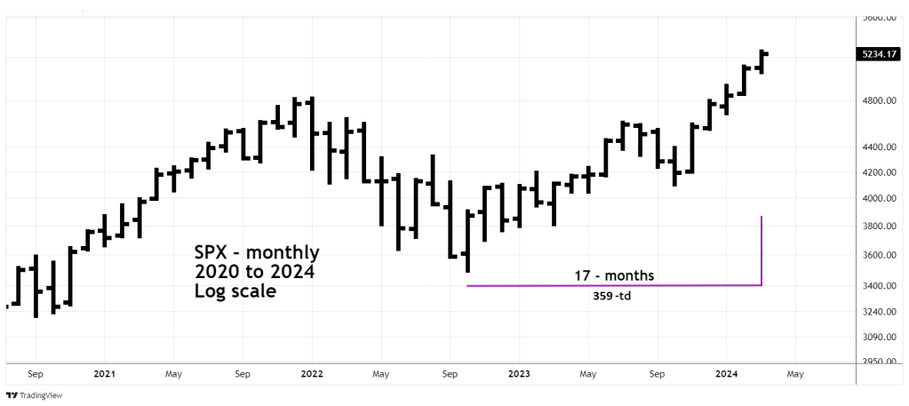 The current bull market is now 17 – months long. As of the high made on 03/21/24 it has lasted 359 – trading days vs. 352 trading days for the 2007 to 2009 bear market.