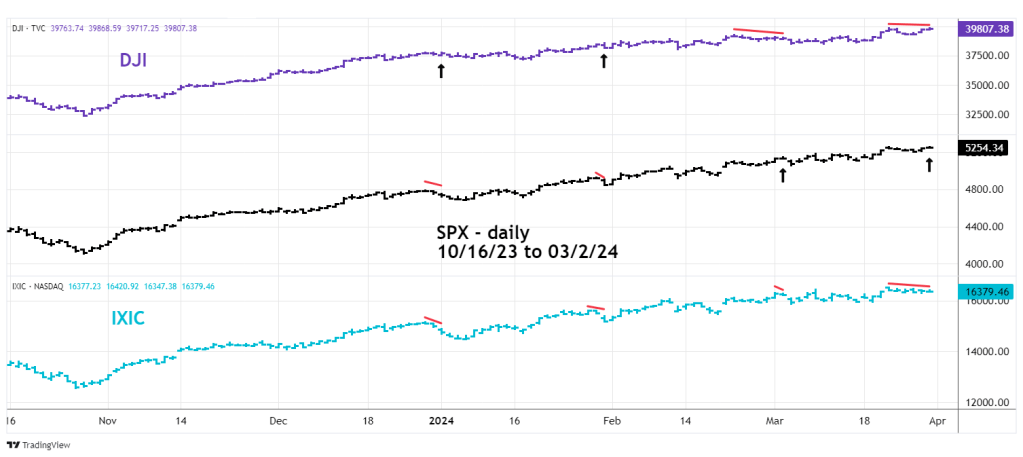 U.S. markets are closed on 03/29/24 for the Good Friday holiday. The 2024 second quarter starts on 04/01/24. A new quarter can sometime coincide with a trend change. Perhaps the beginning of profit taking?
