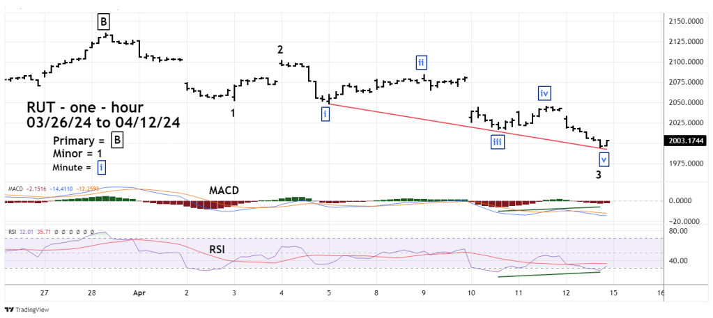 If this wave count is correct, RUT could soon have shallow rally lasting perhaps one to three trading days. If this occurs it could be Minor wave “4” followed by a decline below the 04/12/24 bottom to complete the five wave Impulse down.