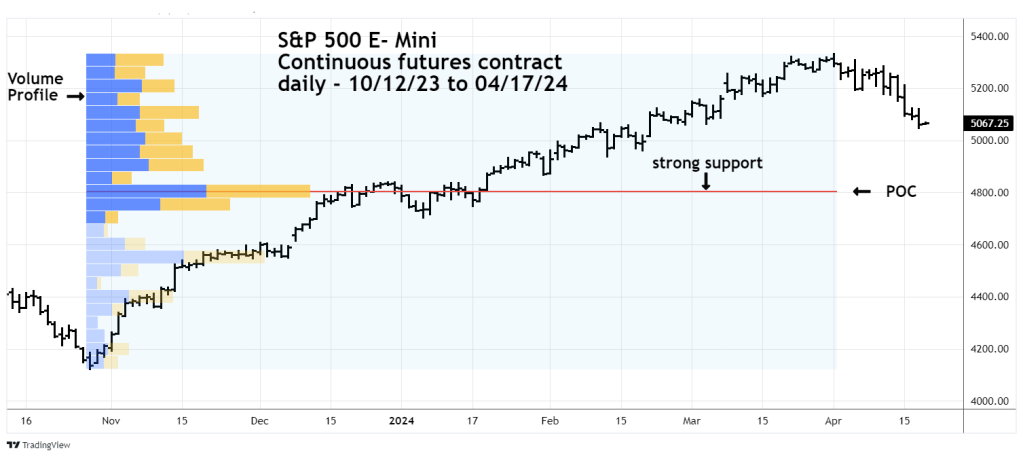The first daily chart courtesy of Trading View shows the Volume Profile for the S&P 500 continuous futures contract.