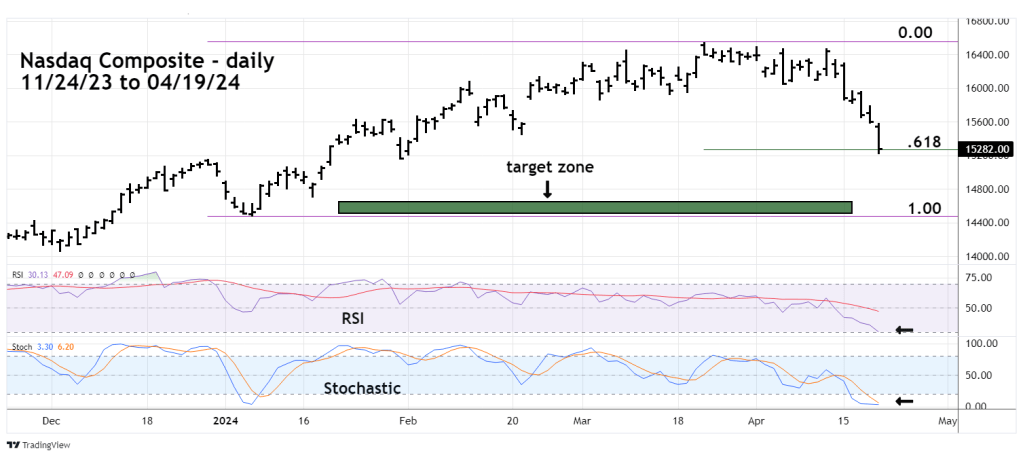 The very bearish action of Nasdaq stocks on 04/19/24 suggests more downside action for the U.S. stock market. Price target for a significant bottom is the area of the January 2024 decline. Time target is late April -early May 2024.