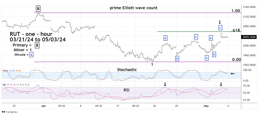 The one – hour RUT chart courtesy of Trading View illustrates its prime Elliott wave count.