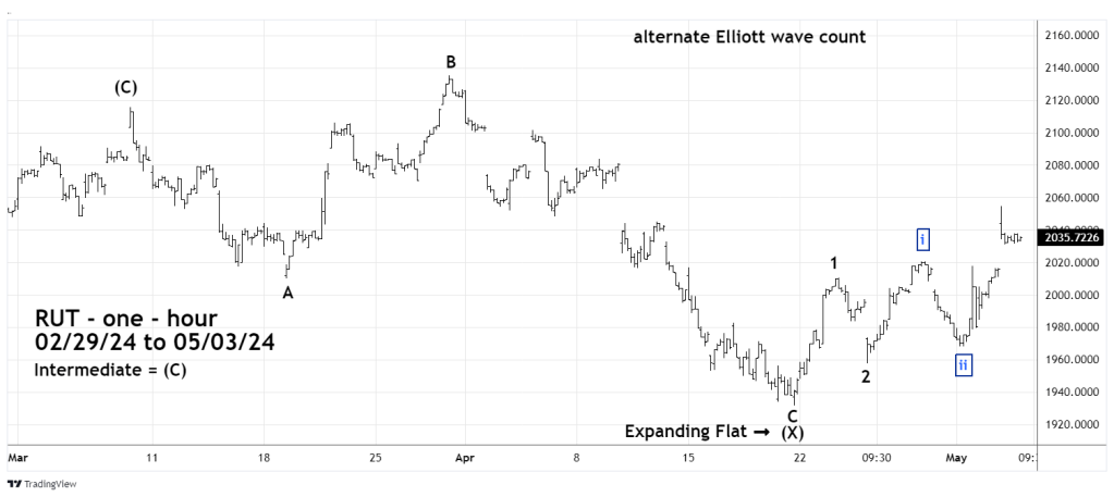 The next one – hour RUT chart shows an alternate bullish Elliott wave count.