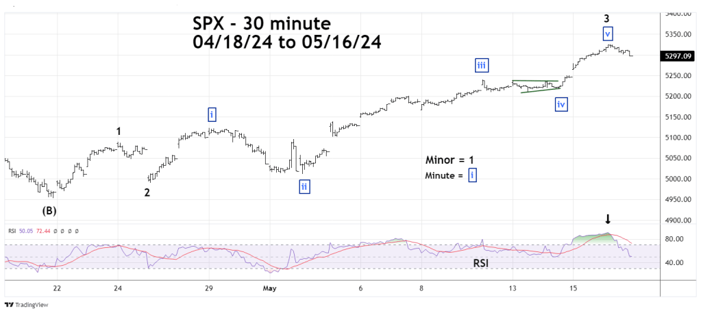 The 30-minute SPX chart updates the short-term Elliott wave count illustrated in the 05/15/24 blog.