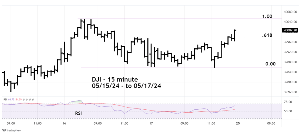 Note that the DJI has exceeded a Fibonacci .618 retracement of its 05/16/24 to 05/17/24 decline. The SPX has only retraced a Fibonacci .50 of its respective decline.