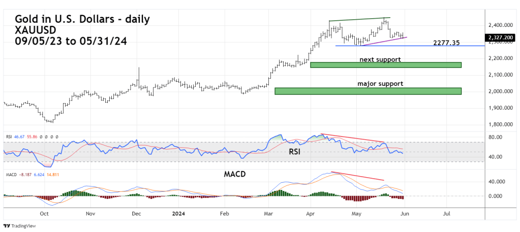 The 05/31/24 daily RSI reading was 46.70 the oversold zone begins at 30.00. MACD lines are above the zero – level. Based on current momentum Gold could have a large move down before making a significant bottom.