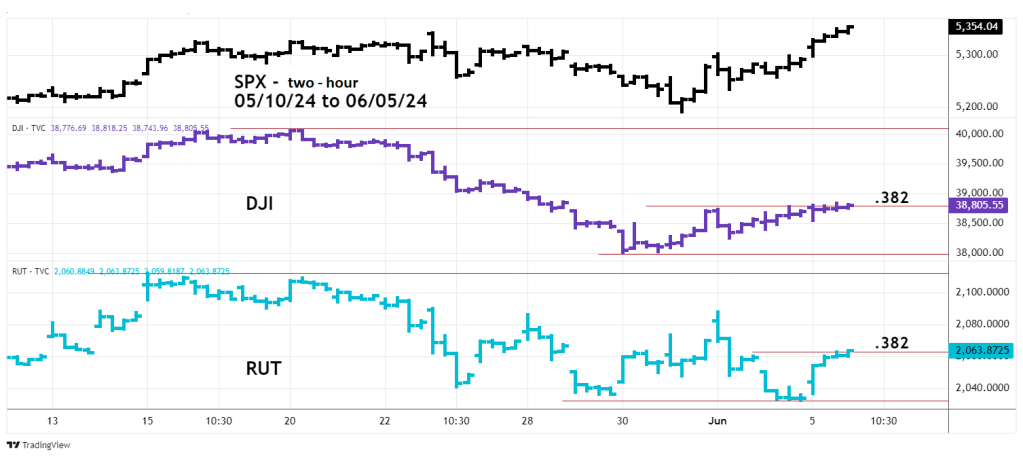 On 05/28/24 the IXIC made a new all-time high unaccompanied by the other two main U.S. stock indices, SPX and DJI. This is what I call a bearish “Rule of the Majority” signal. The SPX and IXIC moves to new all-time highs on 06/05/24 invalidated that bearish signal and is a short-term bullish signal. The DJI could have a hard time making a new high because it has only retraced 38% of its most recent decline.