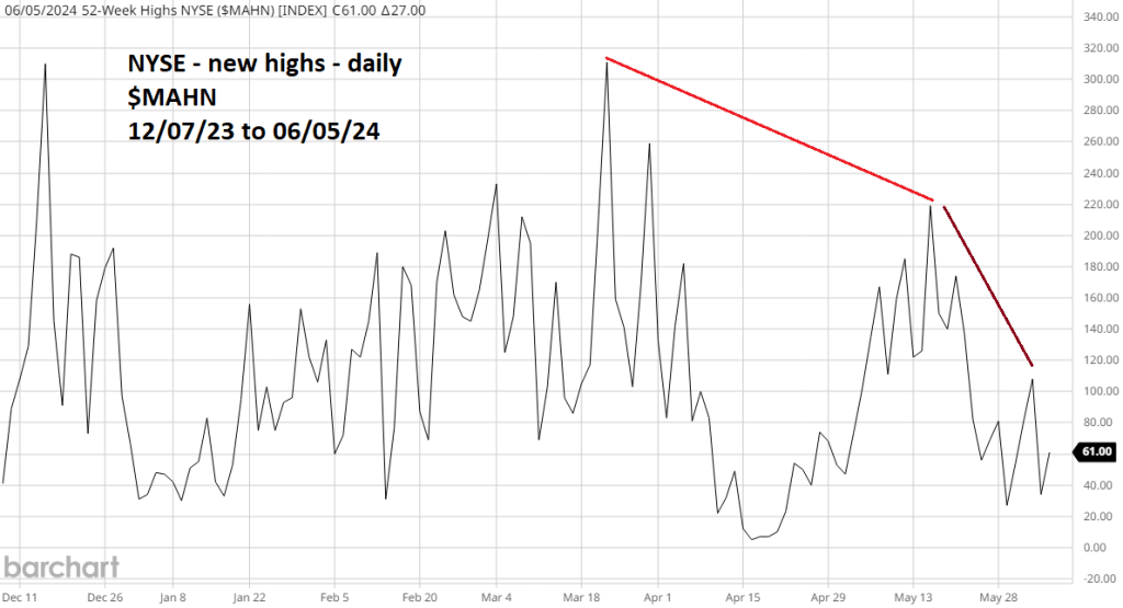 The size of these bearish divergences is shocking! But wait, there’s more. The daily NYSE new highs ($MAHN) chart courtesy of Barchart.com illustrates internal momentum.