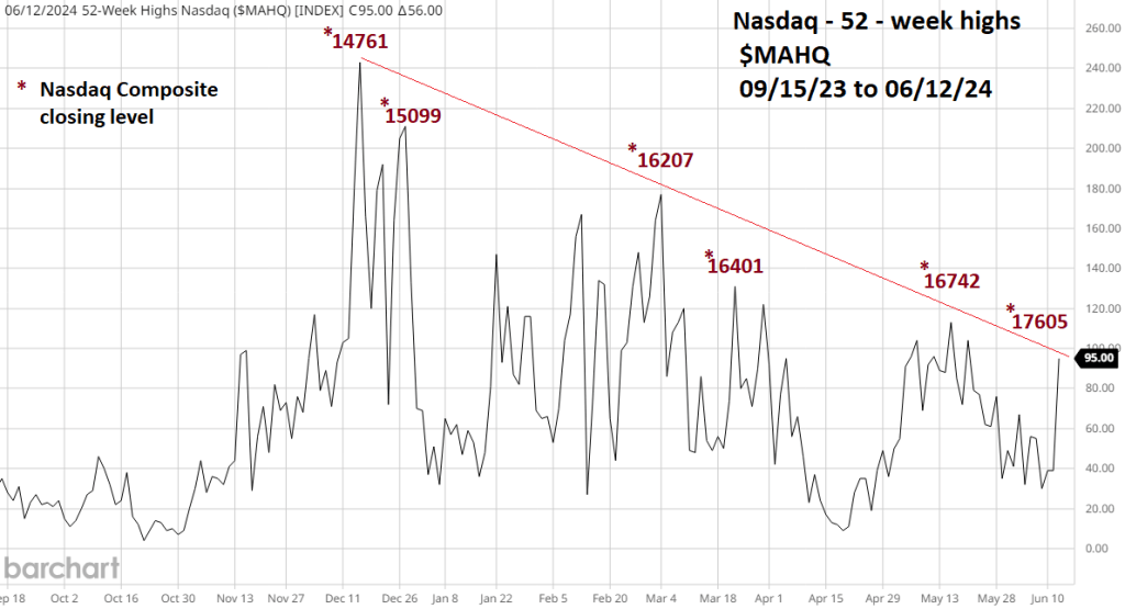 On 06/12/24 the S&P 500 (SPX) and the Nasdaq Composite(IXIC) made new all-time highs. How can the U.S. stock market be shrinking? The answer is illustrated in the Nasdaq new highs chart courtesy of Barchart.com.