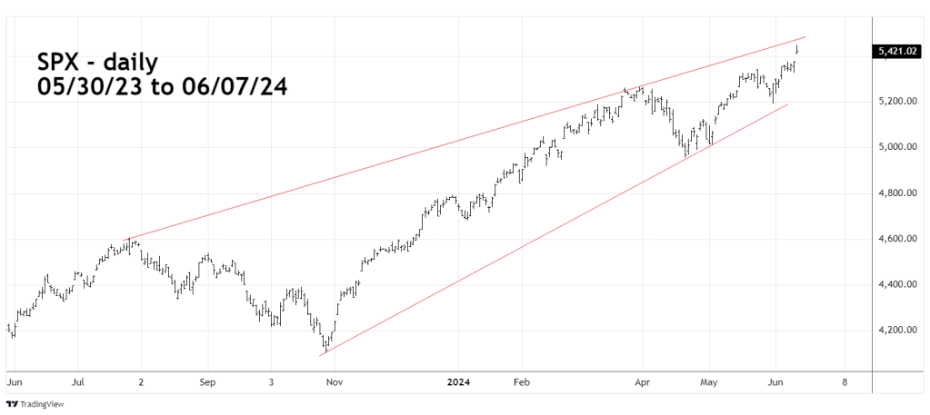 One level is the rising 52 – week trendline connecting the 07/27/23 and 03/28/24 peaks. In the next few trading days this line is in the area of SPX 5,470 to 5,480.