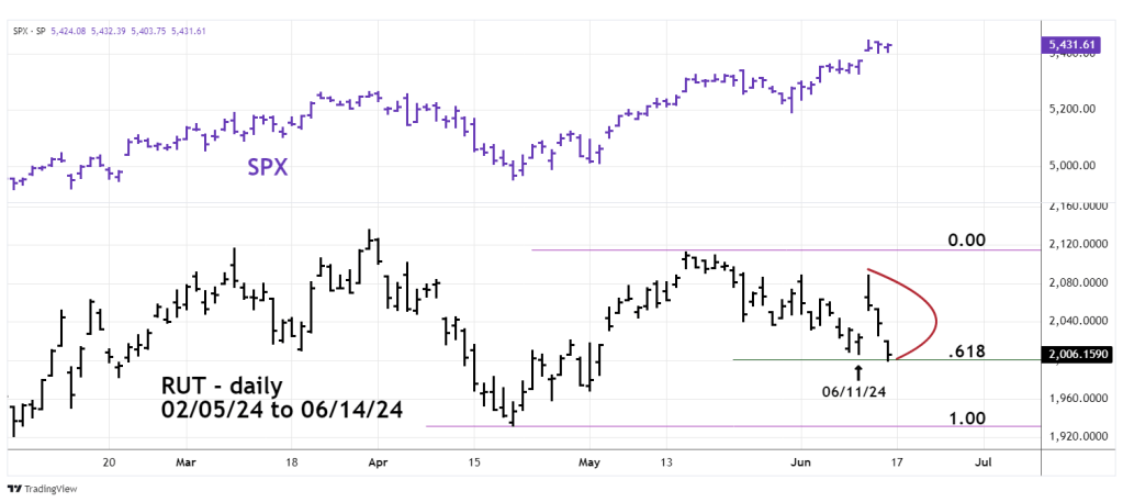In mid – May the SPX exceeded its high made on 03/28/24. The RUT peaked below its 03/28/24 top. From then SPX continued to trend higher while RUT declined. Note the very sharp RUT drop in the prior three trading days. On 06/14/24 RUT broke below its 06/11/24 bottom.